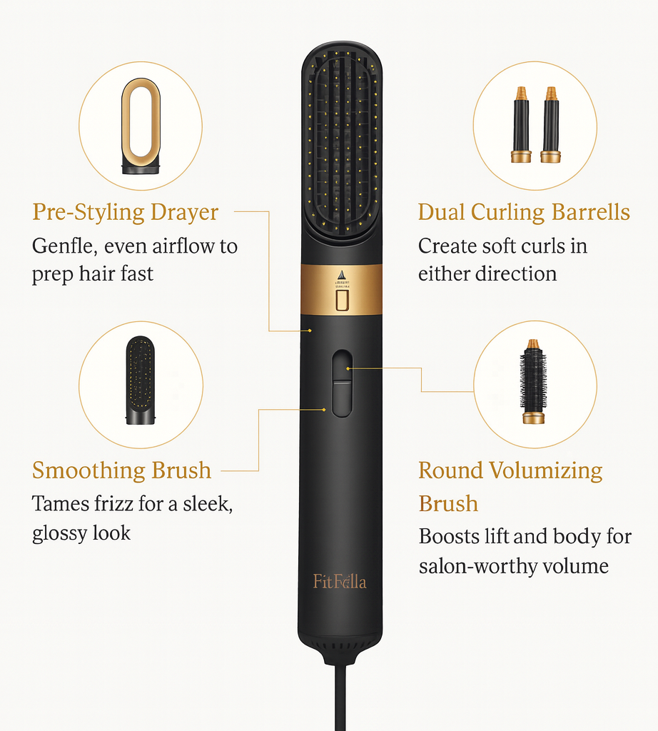 The FitFella 5-in-1 Multi-Styler uses Hydro-Ion™ airflow and ceramic barrels to dry, curl, smooth, and volumize-without extreme heat. Achieve salon-quality bounce, shine, and frizz-free finish in minutes, all while protecting your hair’s natural strength.